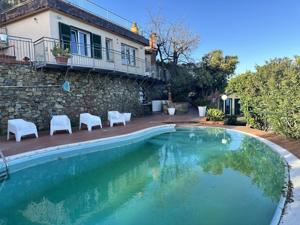 Panoramica Villa con Poiscina in Vendita Zona Bruiciati dfi Albissola Marina con dominante e totale vista mare, Villino indipendente di 90 mq con corte esterna attrezzata e piscina. Immobile di recente costruzione con classe energetica di tipo A, composto di due camere da letto, soggiorno, cucina,bagno, terrazzop e area verde piantumata a frutteto. il lastico solare è attualmente destinato a parcheggio delle auto, con accesso al piano strada tramite cancello elettrico. bagno. Possibilità di ampliamento per altri 100 mq di abitaivo con l'acquisto di indice edificatorio già opzionato dalla proprietà . E' presente il progetto di fattibilità eventualmente da personalizzare.